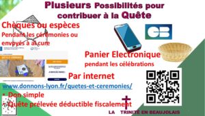 En plus des dons traditionnels en espèces ou par chèques remis lors des messes et cérémonies, Il existe plusieurs solutions innovantes pour participer financièrement à la vie de la paroisse, notamment lorsque vous n’avez pas d’espèces avec vous!